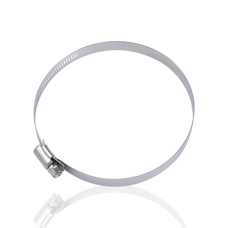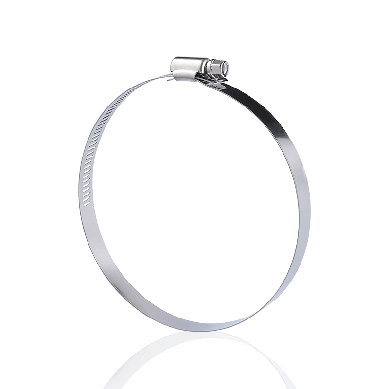 Feito de aço inoxidável de alta qualidade, possui excelentes propriedades antiferrugem e anticorrosão. Mesmo se usado por um longo tempo em ambientes agressivos, como umidade, ácidos e álcalis, ele pode manter a superfície lisa, prevenir eficazmente ferrugem e danos e prolongar a vida útil. Através do processo de estampagem através do furo, a ranhura de mordida na correia de aço é escavada, o que não apenas reduz o peso total, mas também permite que os dentes do parafuso sejam firmemente embutidos na ranhura. Este design proporciona uma força de mordida mais forte no travamento, garantindo a firmeza e vedação da conexão.